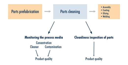 안전하게 관리되는 세척 공정에서도 오염물이 세척조에 축적될 수 있고, 이는 세척 효율을 저하시킨다. 오염물 유입은 세척 성능을 낮출 뿐만 아니라, 이후의 헴굼조로 오염물이 이동하여 부품의 청결도가 낮아지는 등의 문제가 발생할 수 있다. 또한 세척제 성분(빌더 및 계면활성제 등)이 오염물과 결합하여 본래의 세척 과정에 영향을 미치며, 심한 경우 떠다니는 오일에 의해서 부품이 다시 기름칠이 될 수도 있다.일정한 공정 품질을 유지하려면 세척 및 헹굼조의 오염 수준을 지속적으로 모니터링하고, 새로운 배치가 필요하기 전에 이루어지는 적절한 세정조 관리작업이 중요하다. 세정조 관리는 침전 탱크, 응집 분리기, 일반 분리기, 멤브레인 필터 및 증발기 등을 활용하여 진행한다.● SITA ConSpector를 이용한 형광도 측정SITA는 ConSpector를 통하여 세척 및 헹굼조의 최적 사용 시점을 결정하고 배스를 효율적으로 관리하는, 쉽고 확실한 솔루션을 제공한다. SITA ConSpectorSITA ConSpector는 세척 및 헹굼조의 오염 수준을 신속하고 간편하게 모니터링하며, 공정에 또는 실험실에서 사용할 수 있다. 또한 배스 별로 조정 가능한 임계값을 기반으로 새로운 세척 솔루션을 준비할 시점을 시각적 청각적으로 알려준다.세척 및 헹굼조에서 오염물이 필터 용량을 초과하면, 높은 오염 수준이 즉시 감지된다. 필터링 직후에 오염 수준을 직접 제어하여 필터의 정상적인 작동과 효과를 보장할 수 있다. 2주간의 세척조 사용 기간 동안의 오염도 측정● SITA clean line BCSITA clean line BC 인라인 시스템 솔루션은 세척 및 헹굼조의 오염을 지속적으로 모니터링한다. 이를 통해 배스 유지 관리를 체계적으로 제어하고, 새로운 배스를 준비할 최적의 시점을 결정할 수 있다. 또한, 전체 설비의 구성 요소로서 다양한 세척 기술에 쉽게 적용되고, 헹굼조 내 미량의 잔류 오염까지 감지할 수 있다.