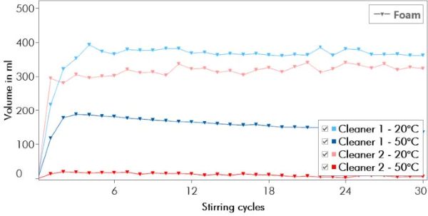 몇 번의 초기 사이클 내에 최대 거품 부피에 도달하며, 클리너 1이 클리너 2보다 약간 더 높은 최종 부피를 기록했다.